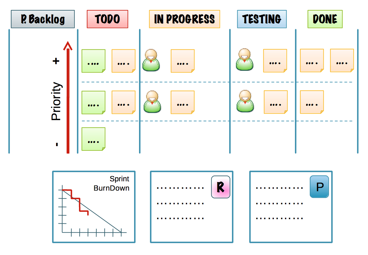- El diagrama burn-down chart para visualizar el tiempo de iteración respecto el trabajo que nos queda pendiente hacer.