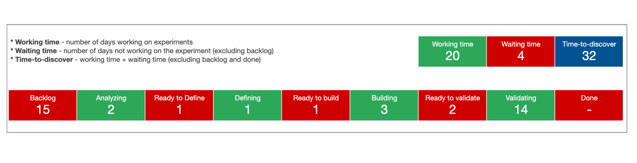 Nuestro time-to-discover por experimento será la suma de todo el tiempo que ese experimento ha estado siendo trabajado como a la espera hasta tener aprendizajes validados – Done.